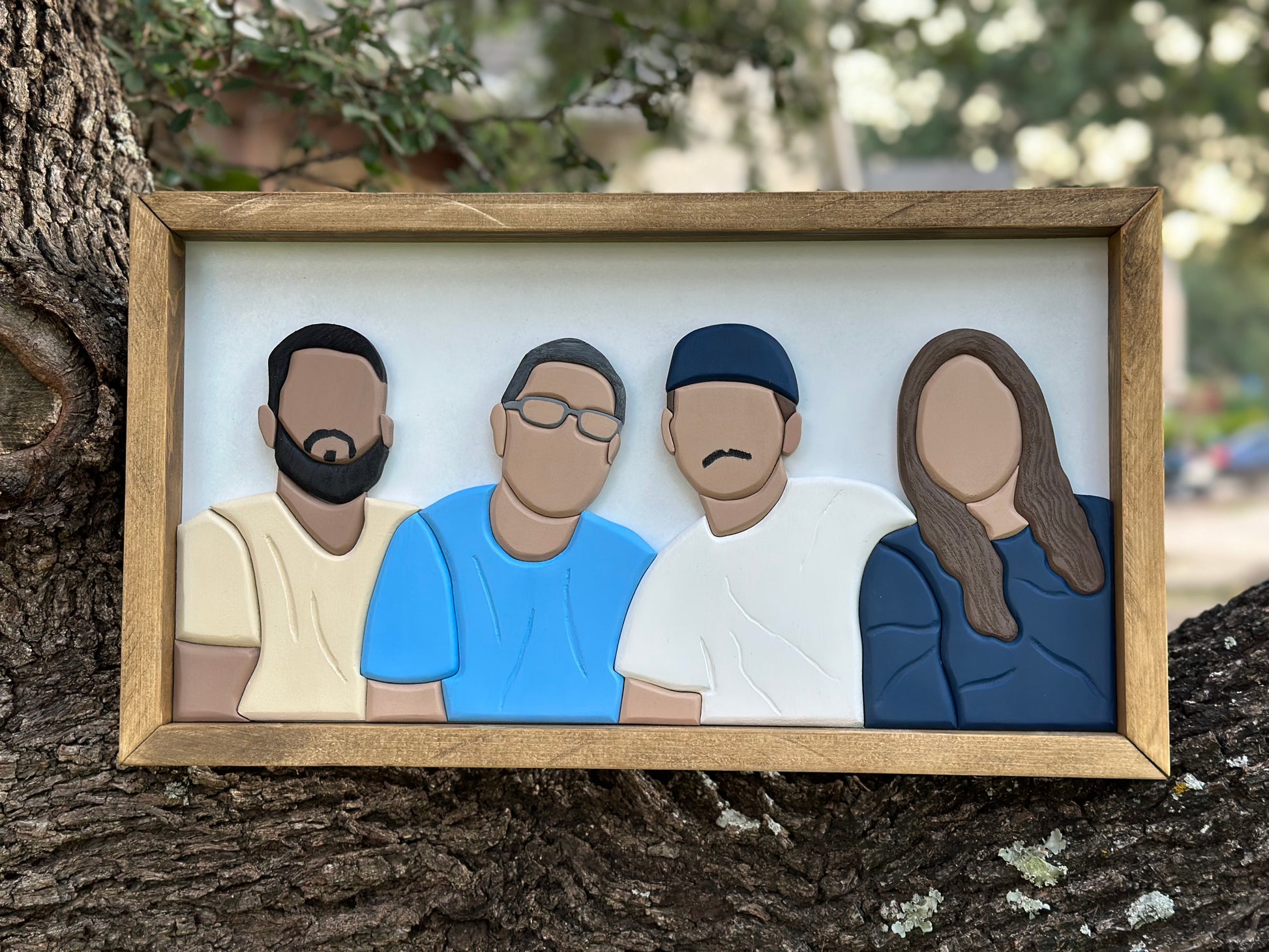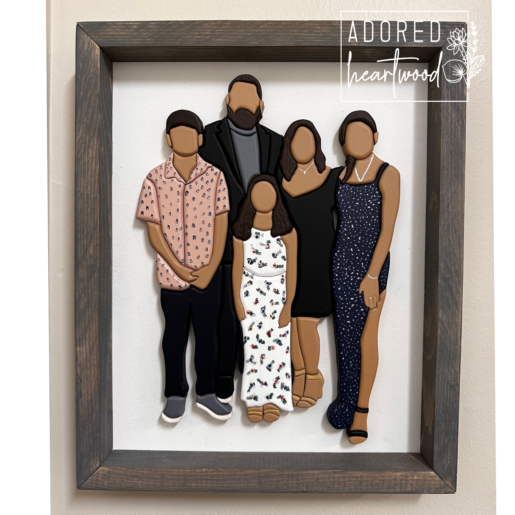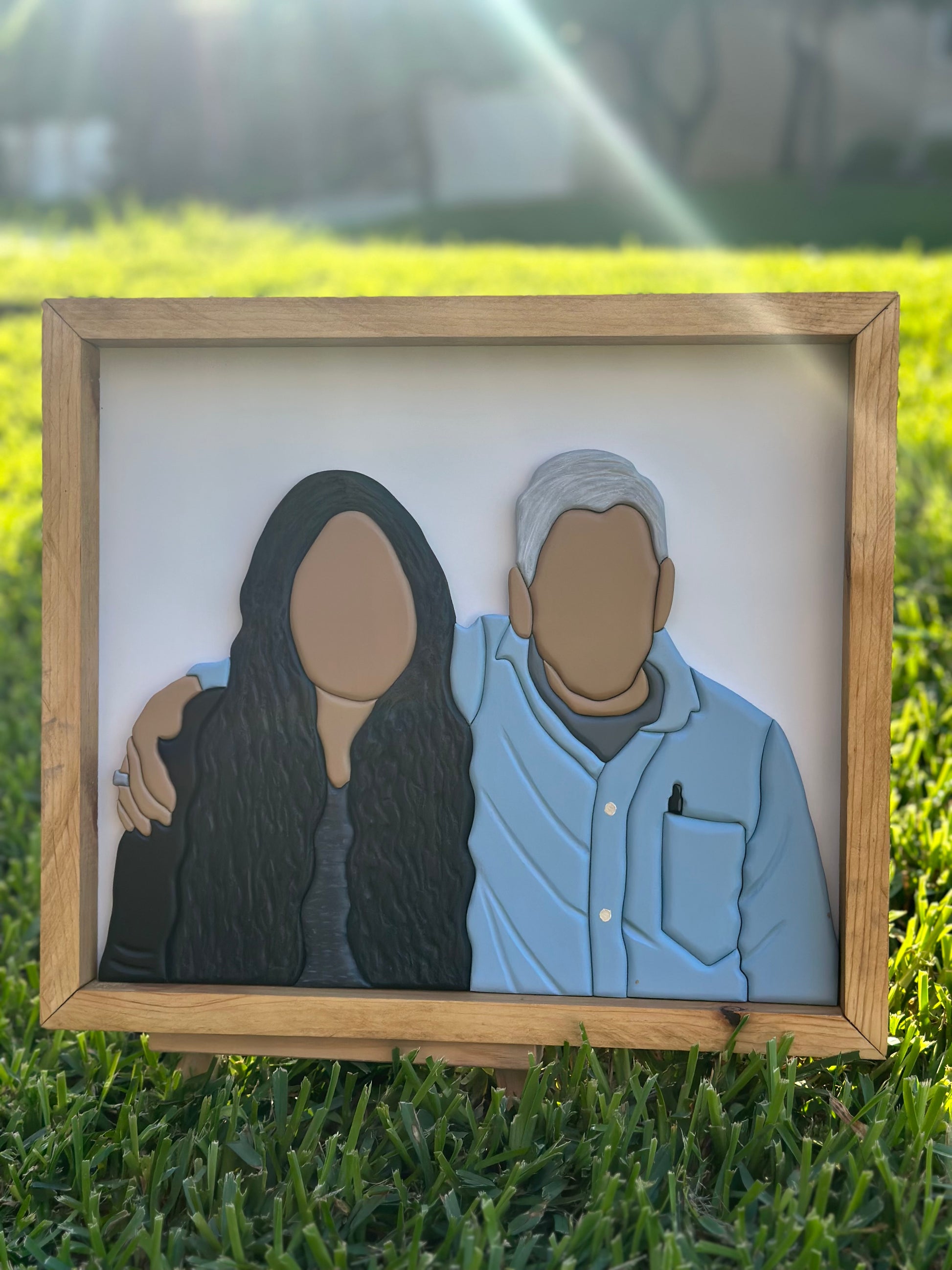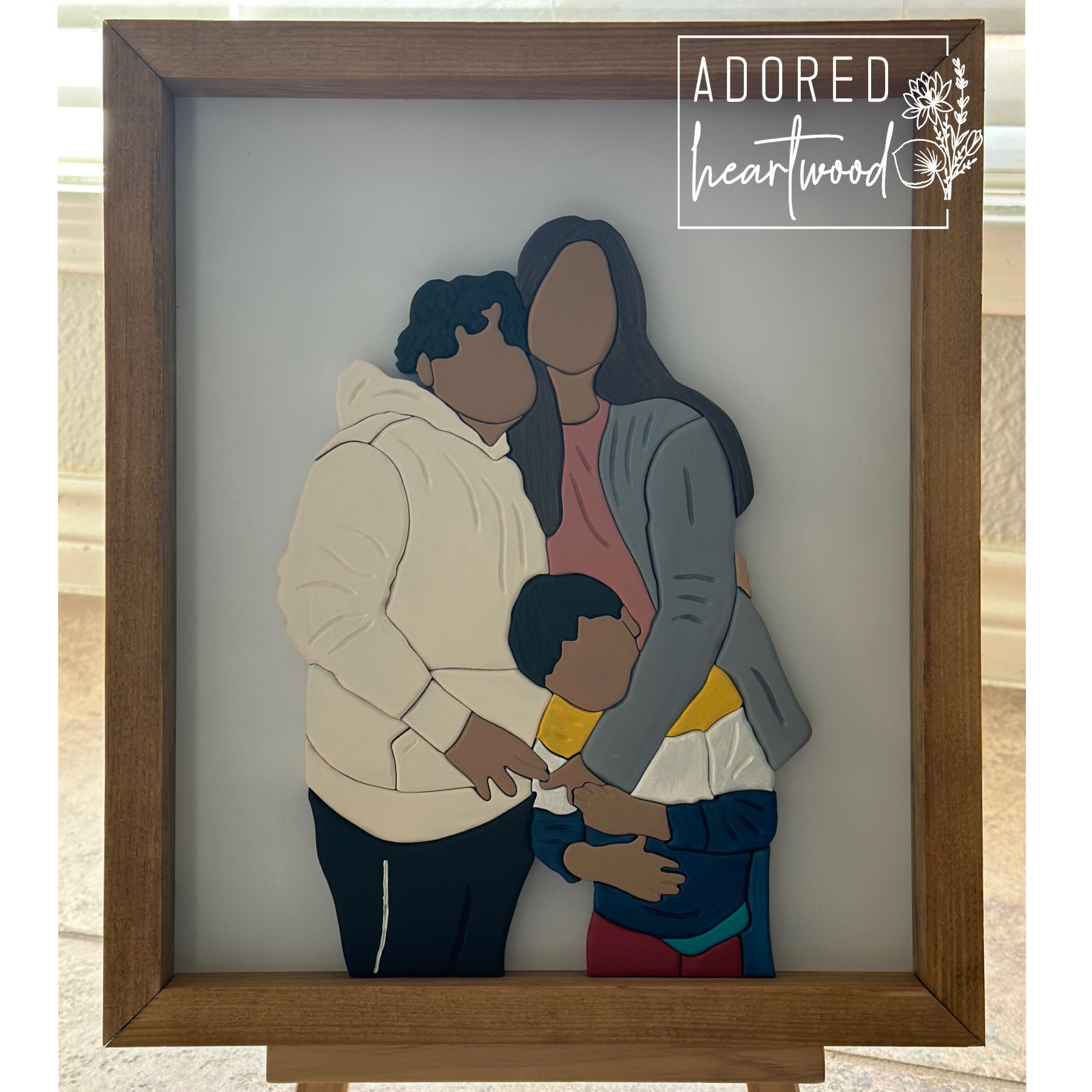 One-of-a-kind Custom Faceless portrait, hand-crafted with love and care. Each piece is uniquely cut and painted by hand, ensuring a personalized touch. All custom work does require a $75 deposit. Please email adoredheartwood@gmail to get yours started!!